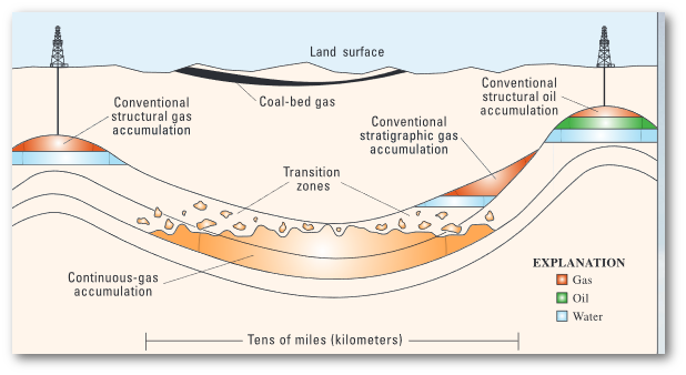 Here’s how a conventional field forms. Note the clear line between the oil or gas (green or red) and water (blue).