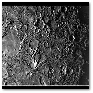 - The surface is generally gray and has been shaped by impacts, nonexplosive volcanism, and planetary “wrinkling.”