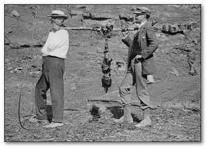 That’s a blob of molten Hawaiian lava Perret (right) and an unidentified man are carrying ever so jauntily. Their clothes burst into flames right after the photo was taken [citation needed]. Source