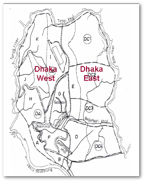 Flood control experts see the city as Dhaka West (where most of the city’s people live) and Dhaka East: