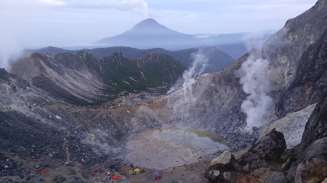 Sinabung, in the background, doesn’t look so little in this 2015 view from Sibayak, home to Sumatra’s first geothermal production field. Note the colorful tents in the foreground for scale. I couldn’t find any information about Singkut but gathered that Sibayak is one of this caldera’s cones. (Image: Palma Bernardo Alexius Hutabarat, CC BY 2.0)