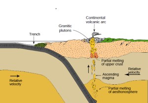 What controls the heat influx into the crust? This is very complex, but I will give you the essence without delving too deeply into details – just the facts. Remember that the Andes and it’s magmatism is part of the Ring of Fire produced by convergence of plates. At convergent margins there is a downgoing (subducting) plate and an overriding plate – in this case the downgoing Pacific or Nazca plate and the continent of South America. Heat is advected into the South American plate crust from the mantle in the form of magma primarily and the rate of magma (and therefore heat) being produced is controlled by the rate at which the mantle can melt. The rate at which the mantle melts is related to a variety of factors . . .