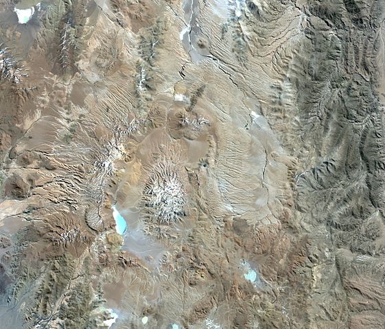 It looks a lot different from space. This is a Landsat 8 image of Galán caldera in the early 1980s. Look for the oval-shaped depression in this vast landscape. It’s got a hill (resurgent dome) on the right and a little lake — deadly but inhabited Laguna Diamente — on the left side. (Image: USGS via Wikimedia, public domain).
