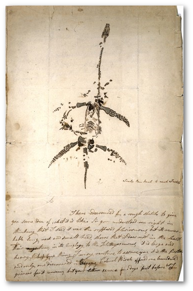 Mary Anning’s letter and drawing announcing the discovery of a fossil animal now known as Plesiosaurus dolichodeirus, December 26,1823. Source