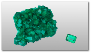 The delicate beauty of emeralds hides the violent past in which they formed. We can thank plate tectonics and related volcanic and metamorphic processes that have happened over geologic time spans for this combination of the rare chemical elements of beryllium and chromium or vanadium into one of the most precious of gemstones.