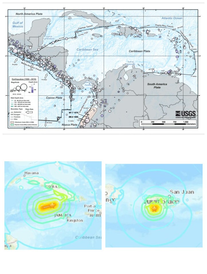 USGS online images of the Caribbean tectonic plate (top); shake map of the January 28th M7.7 event (bottom left); and shake map of the January 7th M6.4 event in Puerto Rico (bottom right).