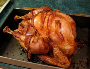 Yale paleontologist John Ostrom…compiled a list of evolutionary specializations found only in birds and dromaeosaur dinosaurs such as Deinonychus [the real-life version of “Jurassic Park’s” velociraptor…BJD]…Most vertebrates have a hinge between the shin bone and the first row of ankle bones, which allows them to turn their foot forwards and backwards. But birds, pterosaurs, and dinosaurs have a joint between the first and second row of ankle bones, a condition found in no other animal. The first row of ankle bones often becomes simply a small cap of bone on the end of the shin bone, and in many dinosaurs, it fuses to the shin bone completely. You can see this even in modern birds. The next time you eat the drumstick (shin bone) of a chicken or turkey, notice the little cap of cartilage at the end of the drumstick. That is actually the first row of ankle bones, fused to the end of the shin bone — a unique dinosaurian feature of your Thanksgiving feast!
