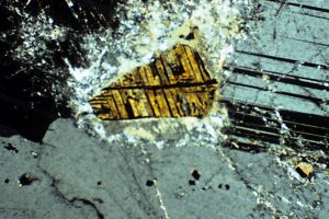 Anorthosite isn’t very visually exciting under the microscope. (Image: Kevin Walsh via Wikimedia, CC BY-SA 2.0)