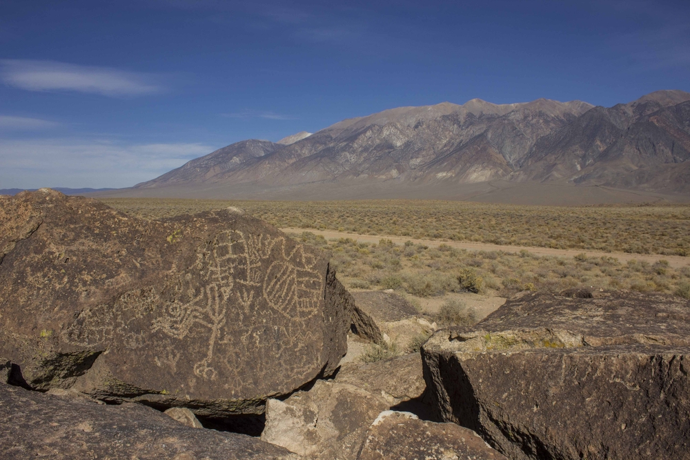 Petroglyphs carved into the tuff just north of Bishop, California, about 30 miles south of Long Valley Caldera. (Image: Stella the Giant/Shutterstock)