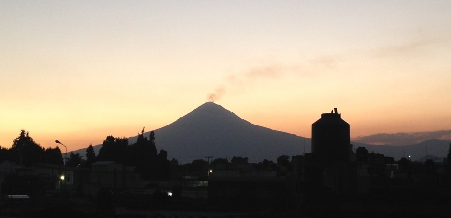There is my favorite volcano — “Smoking Mountain,” in Aztec — standing tall between the city of Puebla and the sunset. (On the other side of the mountain, in Mexico City, they take equally beautiful pictures of the sunrise.)