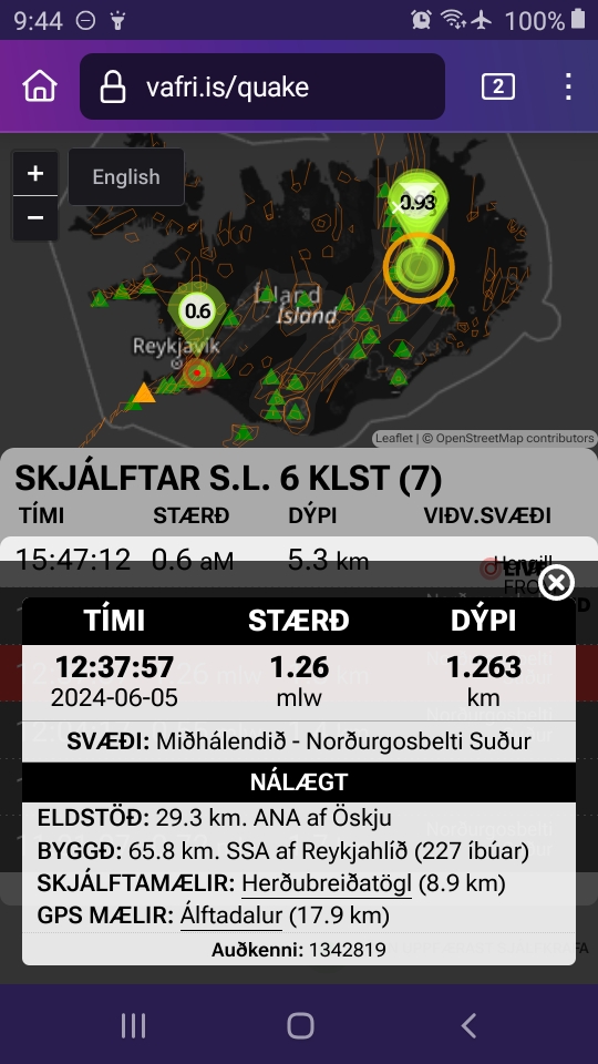 June 5, 2024, 10:39 a.m., Pacific: Askja is still at baseline normal alert level, but this is true as far as quakes go (scientists’ viewpoints I don’t know, but folks at the Lava Centre probably do):
