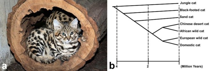 “Phylogeny of the Felis lineage of small cats. (a) Image of a young black-footed cat (Felis nigripes). Courtesy of Cleveland Metroparks Zoo, Cleveland, OH. (b) This felid phylogeny suggests that the black-footed cat (Felis nigripes) had a common ancestor with the domestic cat (Felis catus) approximately 3 million years ago. Adapted from Li et al. 17.” (Figure 1 and caption, source, CC BY 4.0).