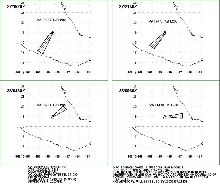 Update, May 27, 2023, 10:01 a.m., Pacific: Late yesterday afternoon, CENAPRED posted an update, noting that Don Goyo’s signs and symptoms had decreased a bit, but they kept the alert at YELLOW 3.