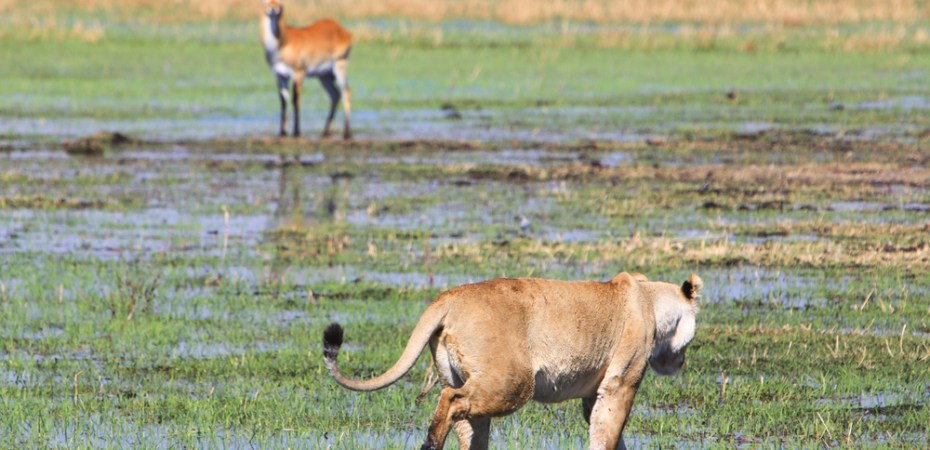 Yes, we’re still in Africa, about 1,700 miles from the Serengeti; and they do start out with a cheetah, which we’ve seen quite a bit of lately; but that speedster isn’t mentioned again once water covers the land, though a leopard and — especially — the lions carry on.