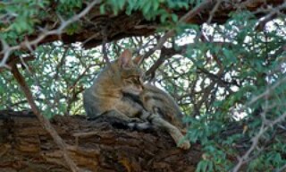 Steppe/bush cats are mostly nocturnal, coming out after sunset. They’re ground hunters, but these excellent climbers often use trees as escape routes.