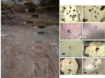 Flagg Ranch exposure showing lower unknown ignimbrite (ash flow), the Lava Creek Tuff (LCT) ash fall deposit, and upper ignimbrite of the LCT. Thanks to work by Montana State University geologists, it is now known that the unknown ignimbrite was deposited immediately prior to the ash fall, with no significant time gap in between. Photo by Stacy Henderson (PhD student in Montana State University’s MOnSTER lab). Melt inclusion photos courtesy of Bryana McKay (M.S. student in Montana State University’s MOnSTER Lab)./p>