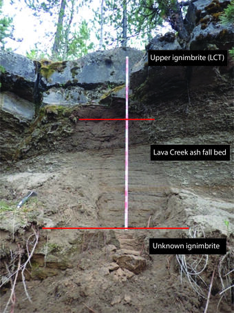 To explore this question, let’s take a trip to a well-studied exposure of the LCT that lies along the Snake River near Flagg Ranch in Grand Teton National Park, just south of the Yellowstone National Park boundary. This outcrop contains one of very few exposed ash-fall deposits of the LCT—that is a deposit formed by ash that settles from a tall eruptive plume, rather than one that sweeps across the landscape as a flow. The ash-fall unit is capped by an ash-flow deposit, called an ignimbrite, of the LCT eruption but overlies an ignimbrite of “unknown origin.” What is this lower “ignimbrite of unknown origin” and how do we determine where and when it came from?