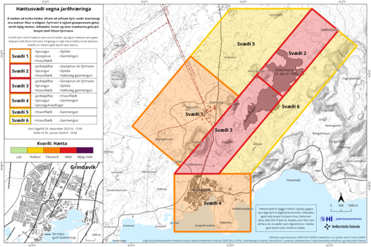 The Norwegian Meteorological Agency has published an updated risk assessment map based on the combined interpretation of data at a scientific consultation meeting held this morning. The assessment of the danger level within the areas is unchanged from the last time. However, a change has been made to the dangers that are possible within zone 4, Grindavík. There have been added dangers due to possible lava flow and gas contamination. The reason for the changes is the increased probability of a volcanic eruption north of Grindavík. However, those changes do not affect the overall assessment of the danger level of the area. This risk assessment card is valid until January 5, without any changes.