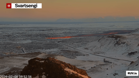 An effusive eruption has started around 07:58 UTC north of Grindavík The eruption is visible on webcameras and is taking place near Hagafell. Helicopter is going to check the area to confirm the location and size of the event. More information will be available shortly. The aviation color code is changed to red for the time being.