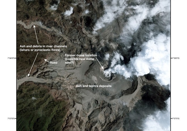 On 13 February 2014, the Indonesian National Board for Disaster Management (Badan Nasional Penanggulangan Bencana-BNPB) reported that a major eruption occurred at Kelut (also known as Kelud) volcano in East Java, Indonesia. Ground-based observers had little insight about the ash plume height, but a number of satellite observations helped to constrain the height and other eruption parameters such the direction of plume movement. CALIPSO satellite data revealed that a rapidly rising portion of the plume ejected material up to an altitude exceeding ~26 km, well into the tropical stratosphere. Most of the less rapidly rising portions of the plume remained lower, at 19-20 km altitude. The 2014 eruption destroyed a dome emplaced in the volcano’s caldera during the previous eruption in 2007 (BGVN 33:03 and 33:07). According to BNPB in a report issued on 18 February 2014, ~7 people were killed and ~100,000 evacuated. At least one commercial aircraft flew into the plume, later landing successfully but incurring costly engine damage.
