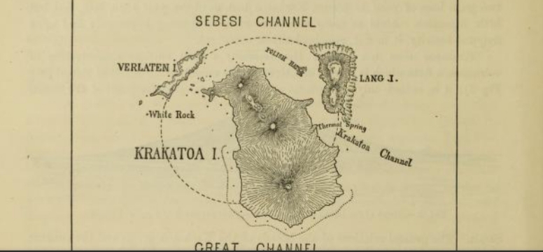 Figure 3 in the 1888 Royal Society committee report shows the archipelago as it was before the eruption. What’s left of Verlaten is now called Sertung; the Lang remnant is Panjang; and Rakata, the southernmost (bottom) of the three volcanoes that made up Rakata or Krakatoa Island, was sliced more or less in two as the rest of the island went down during caldera collapse. You can see Rakata’s cross-section in the image at the top of this post.