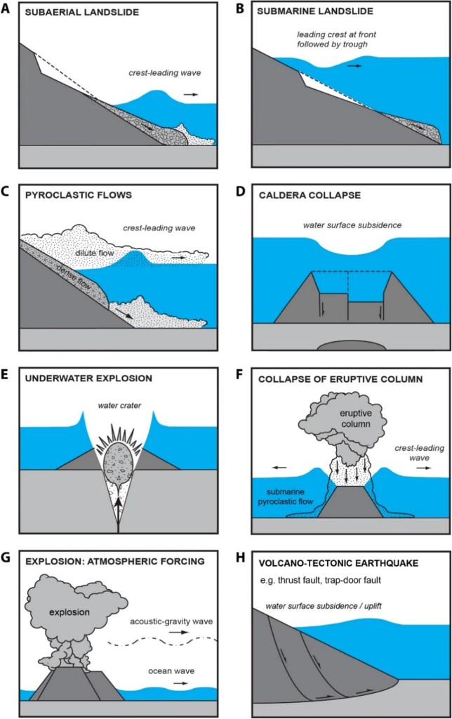 Figure 1 in Schindele et al. (CC BY-SA-NC 4.0) shows the many ways that volcanoes can mess you up with a tsunami. More than one of these can happen during an eruption, sometimes causing tsunamis all at the same time.