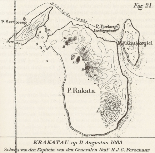 Captain Ferzenaar made this topographic map two weeks before the final paroxysms began. Part is blank because he did not go there. The island was erupting, particularly around Danan, “D,” through multiple vents and there also were active fumarole fields.