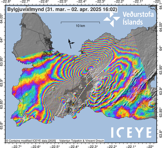 April 3, 2025, 3:8 p.m., Pacific: Check out this spectacular interferogram from the Icelandic Met Office today!