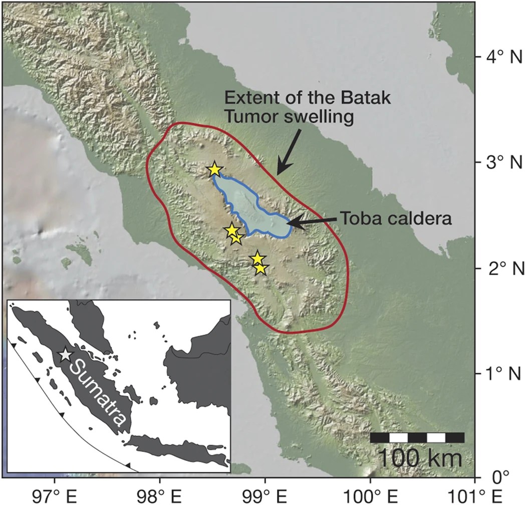 In 2017, Mucek et al. reported finding chemical similarities between the Youngest Toba Tuff eruption (the last one, 74,000 years ago) and lava erupted by an ordinary stratovolcano called Sinabung, 19 miles north of Toba.