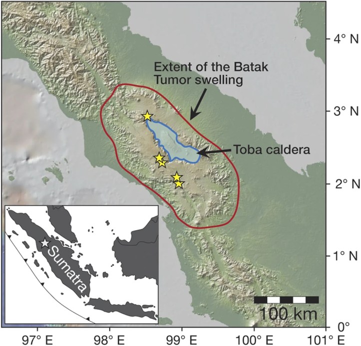 After this Youngest Toba Tuff supereruption, an estimated 1% or more of Earth’s surface was covered in volcanic ash 4 inches or more deep.
