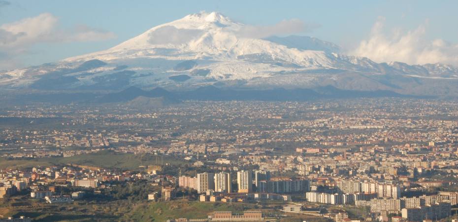 Massive Mount Etna (Image showing the snow-capped fire mountain on a sunny day with the city of Catania in the foreground by Ben Aveling, via Wikimedia, CC BY-SA 4.0) – 37 miles long, 25 miles wide, and towering 2 miles above the blue Mediterranean — was a natural for the Decade Volcano selection committee.