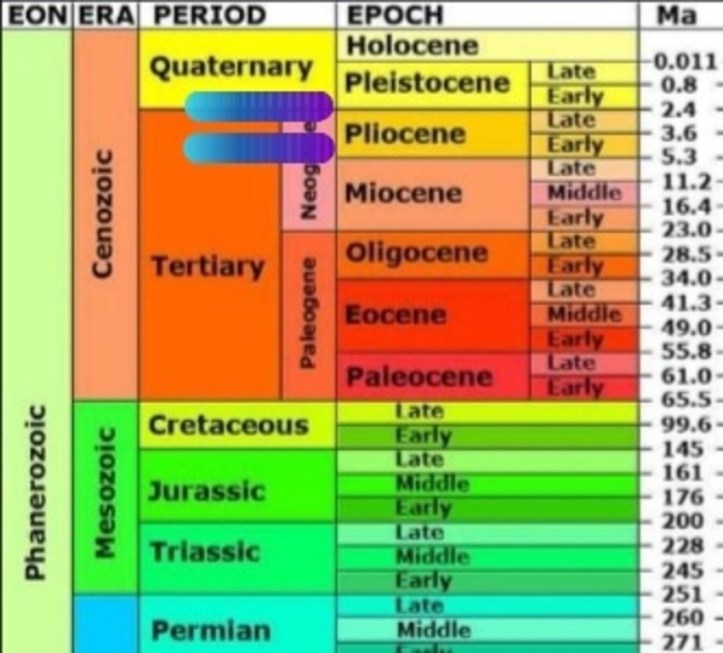 The blue-spectrum lines are pointing at the whole Pliocene epoch and the early Pleistocene. (Source, public domain)