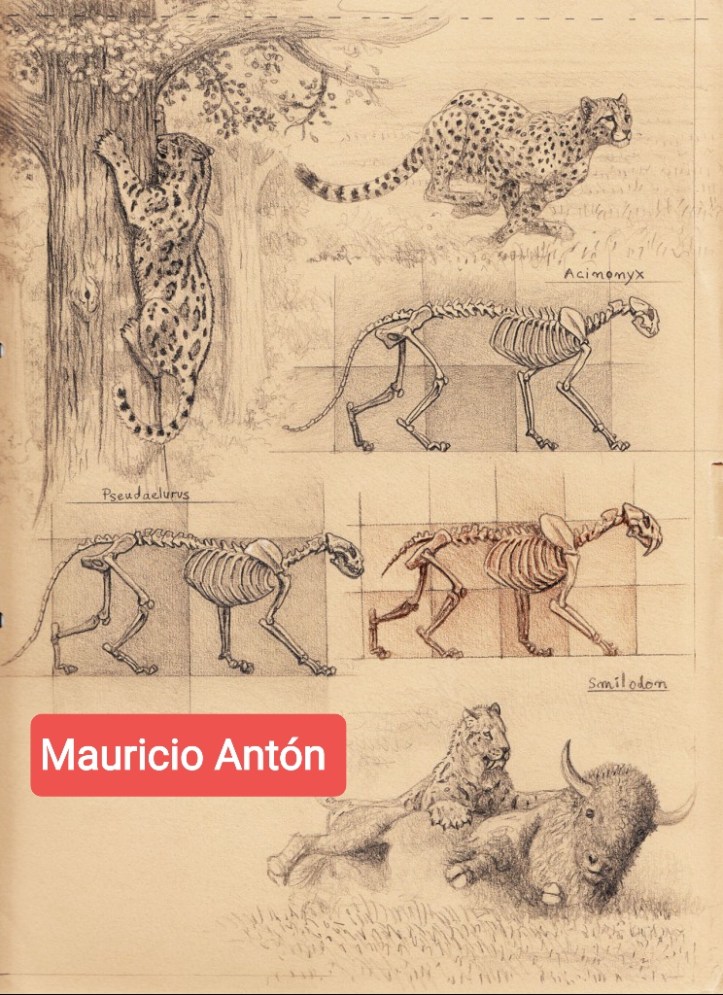 That’s one of the Pseudaelurus cats on the left. Antón sketched out a comparison of its possible appearance and its skeleton with those of a cheetah (top right) and Smilodon (bottom right) — two VERY different cats but both advanced enough in evolution to be called Ferraris.