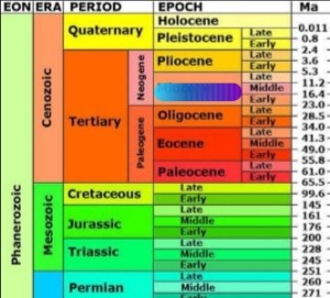 The blue-spectrum line is pointing at the Early to Middle Miocene. (Source, public domain)
