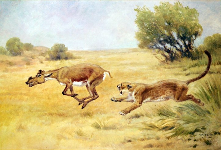 Dinictis chasing a primitive and humpless camelid. (Image: Charles R. Knight via Wikimedia, public domain)