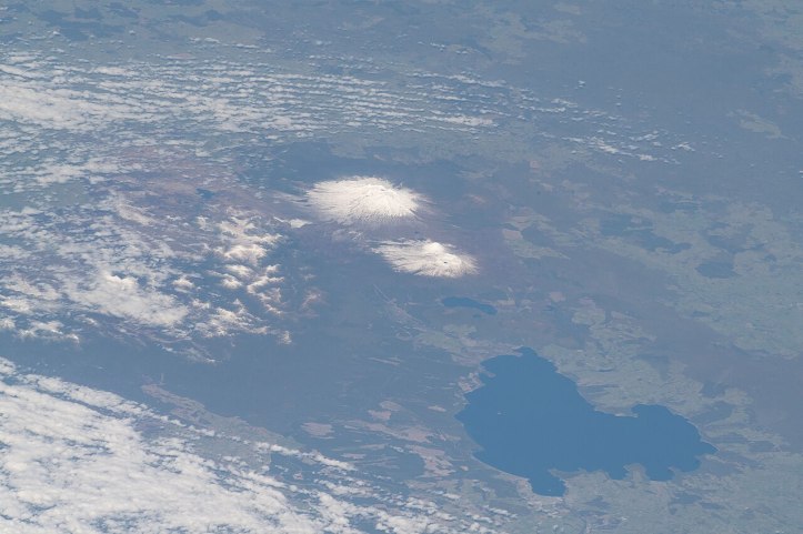Those two white dots in this low-orbit satellite view from the north (by NASA via Wikimedia, public domain) are the movie stars and, on the ground, they are part of Tongariro National Park.