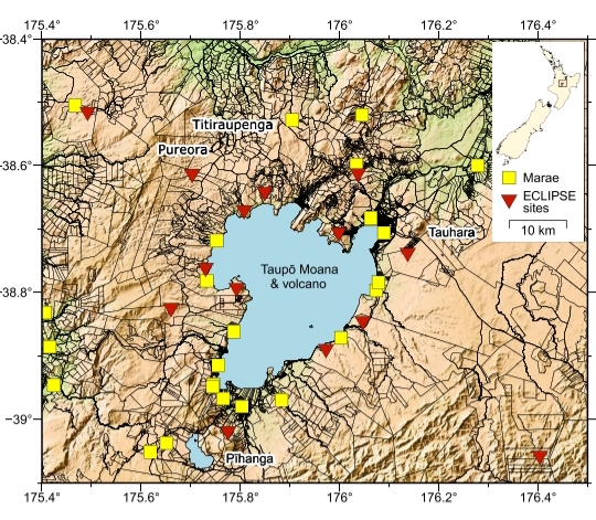 Figure 1 from Mestel et al. (2025a) shows signs of two cultures living and working around Taupo Lake (“Moana”) and Volcano. Yellow squares are Maori (Polynesian) meeting houses; black lines and red triangles mark the infrastructure and seismic stations, respectively, of European-related New Zealanders and geoscientists (whose team worked closely with the Maori to get permission to set up that temporary study network around sacred Lake Taupo.